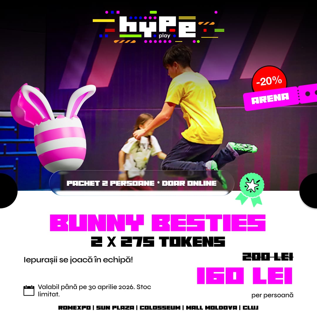 Bunny Besties este un pachet pentru 2 persoane, creat pentru joacă în echipă. Include 2 × 275 tokens, câte un set de tokens pentru fiecare persoană, care pot fi folosite la atracțiile din Hype. Este alegerea ideală pentru prieteni, cupluri sau challenge-uri unu la unu, fără restricții de activitate sau timp.